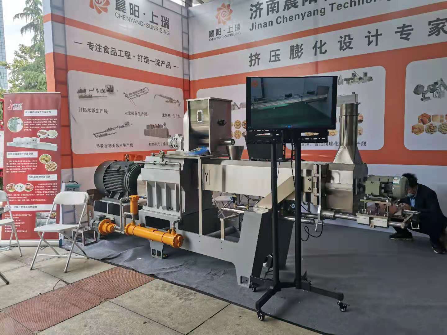 濟南晨陽科技專注于擠壓膨化行業,我們的設備有 夾心米果設備 自加熱米飯設備 膨化食品設備 寵物飼料設備 營養大米設備 水果燕麥片生產線 米果膨化機 營養米粉設備 變性淀粉生產線 可食用大米吸管設備 寵物咬膠設備 嬰兒磨牙棒機器設備,展會空間有限 只能做部分展示,想了解更多,歡迎各位來我司參觀!!!
