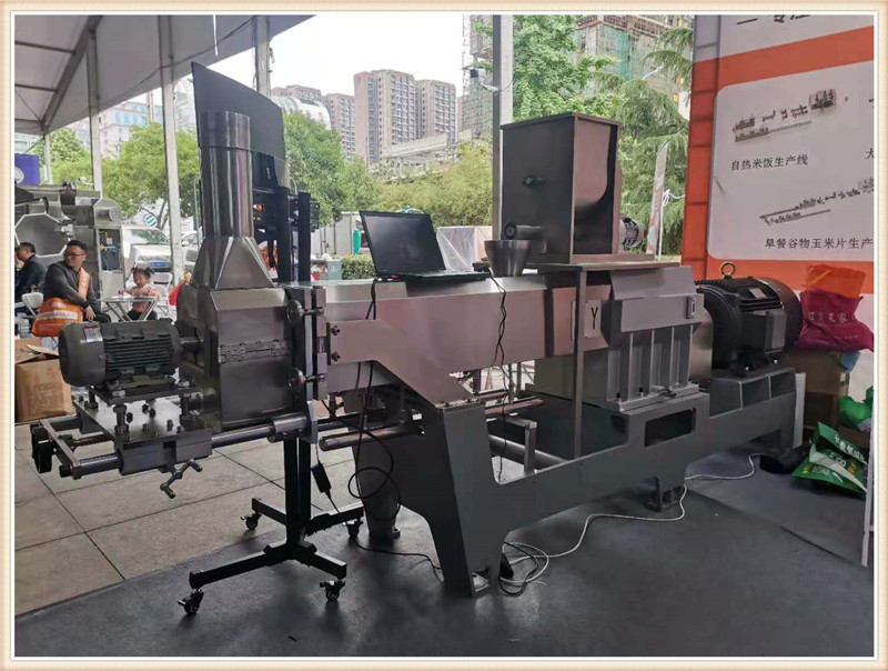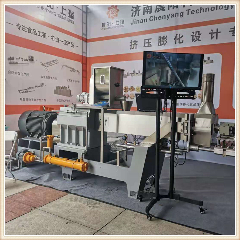 濟(jì)南晨陽(yáng)公司攜帶新款CY65雙螺桿膨化主機(jī)亮相第19屆漯河食品博覽會(huì),一經(jīng)亮相,變引起了眾多膨化食品生產(chǎn)企業(yè)的關(guān)注咨詢。詳細(xì)詢問(wèn)該新款機(jī)型的性能特點(diǎn),和核心產(chǎn)品加工。該款65主機(jī)搭載45kw-6級(jí)電機(jī)直連傳動(dòng),齒輪箱使用原裝南京擠出機(jī)箱體,螺桿使用分段積木組合結(jié)構(gòu),機(jī)桶使用內(nèi)壁噴涂耐磨襯套材料。機(jī)桶恒溫控制,PLC自動(dòng)控制,切割模頭升級(jí)。