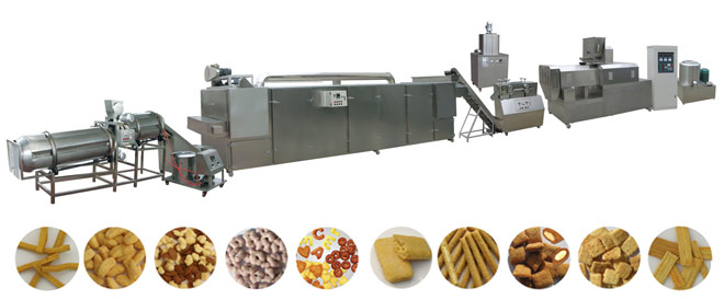 5.谷物膨化與夾餡:這是產(chǎn)品生產(chǎn)的關(guān)鍵工序,物料膨化的好壞直接影響zui后的質(zhì)感和口感,物料在擠壓中經(jīng)過高溫,高壓成為流動(dòng)性的凝膠狀態(tài),通過特殊設(shè)計(jì)的夾心模均勻穩(wěn)定地?cái)D出完成膨化,同時(shí)餡料通過心機(jī)擠壓,經(jīng)過夾心模均勻地注入膨化酥中,隨膨化物料一同擠壓出來,擠出時(shí),物料水分降至9%-10%.