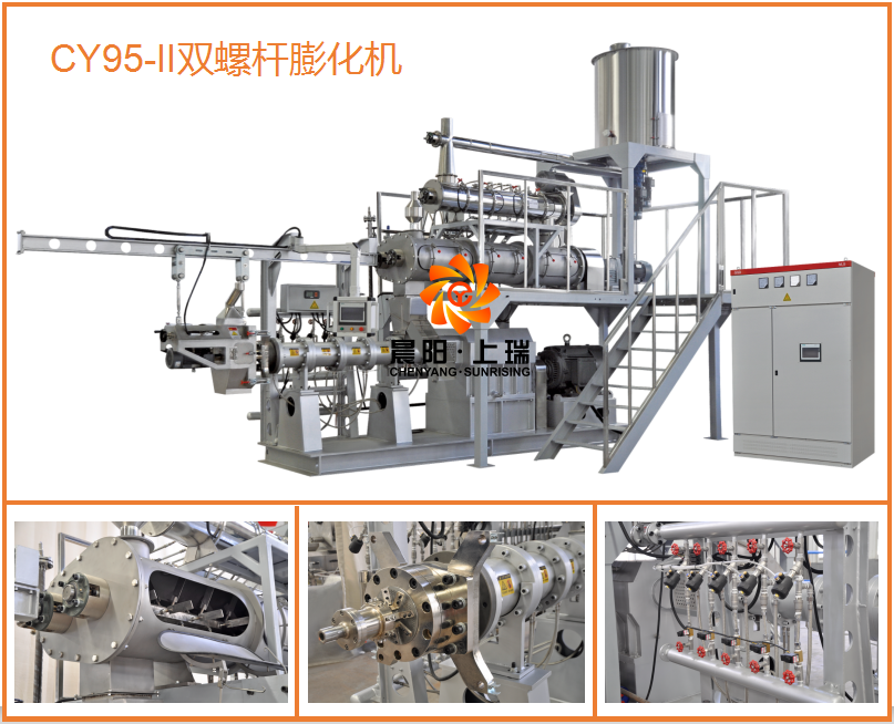 晨陽CY95-II雙螺桿膨化機,主電機搭載110kw,變頻調速。變速箱使用NSK軸承,南京原裝箱體。使用壽命長,機筒使用45鋼圓形機筒內鑲嵌合金襯套,文丘里使用38CrmoaL,螺桿長徑比19.5.整體使用積木組合螺桿,雙頭螺紋,材質38CrmoaL。產能2.5T/h,磨損壽命達2萬噸以上,機器良好的齒輪箱和機筒螺桿組合可以保證24小時不停機生產。膨化機喂料方式采用圓盤是破拱喂料器,喂料均勻穩定,調制器使用單軸調制器加雙軸差速調制器,調制效果好,熟化度高,調制器特別配置鮮肉添加功能,實現鮮肉狗糧生產功能。膨化機使用PLC自動控制,控制機筒溫度和其它電機參數。調制器蒸汽、水添加分手動控制和自動控制,自動控制添加可以通過比例調節閥實現參數自由設定化,達到和5-10噸膨化機臺異曲同工之處。