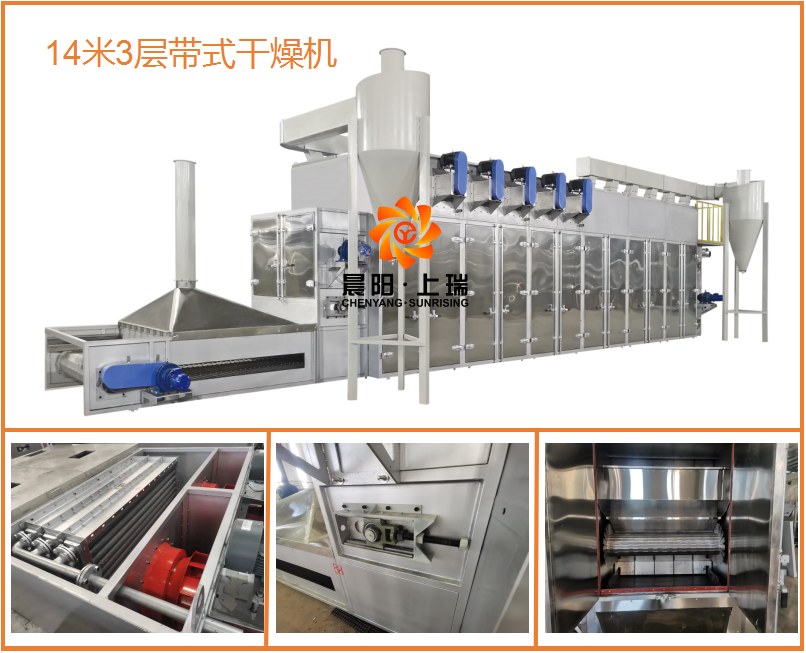 干燥方面,客戶技術指標,成品大于2H/h,脫水率:32%降至5%以內,對脫水干燥能力具有較高的要求, 晨陽干燥機本次配置14米3層干燥機,帶寬2米,箱室高度達2.4米,通風對流效果好,中間段12米,2米一節。使用不銹鋼鏈板網帶,使用壽命長,鏈板基本上沒有維修率,鏈板沖孔方式使用晨陽設計的新技術,透風性好,支撐能力強,托料能力強。一平方承載22.5-35公斤物料。3層鏈板獨立變頻調速,烘干停留時間30-90分鐘。2段控溫,自動比例調節閥。蒸汽加熱,使用碳鋼無縫管鋁翅片,散熱好,能源利用高,獨立變頻的排濕系統,濕度數顯,數據化操作。出料端設計3米強制冷卻段,迅速降低顆粒表面溫度。確保在后端噴涂前工藝緩沖倉不會因溫度過高產生熱汽結團