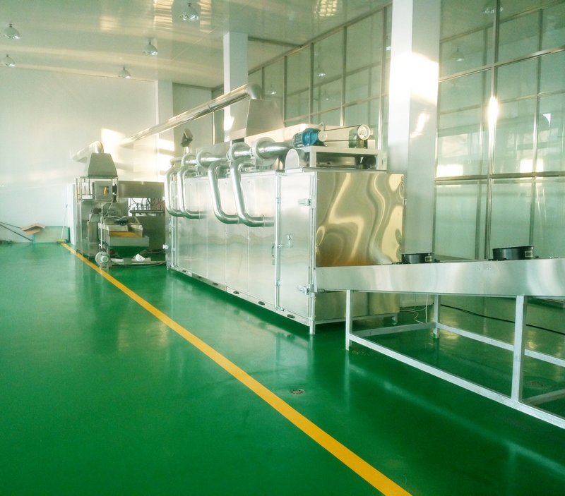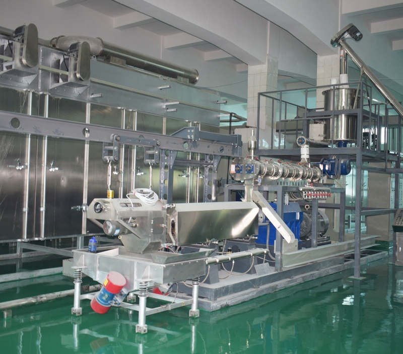 大型生產線:自動配料站→粉碎機→混合機→膨化主機→振動篩-風送機→均質滾筒-風送機-多層振動烘干機→風送機-微波干燥-風送機-二次烘干機-風送機-多層振動冷卻機-Z型提升機-包裝機