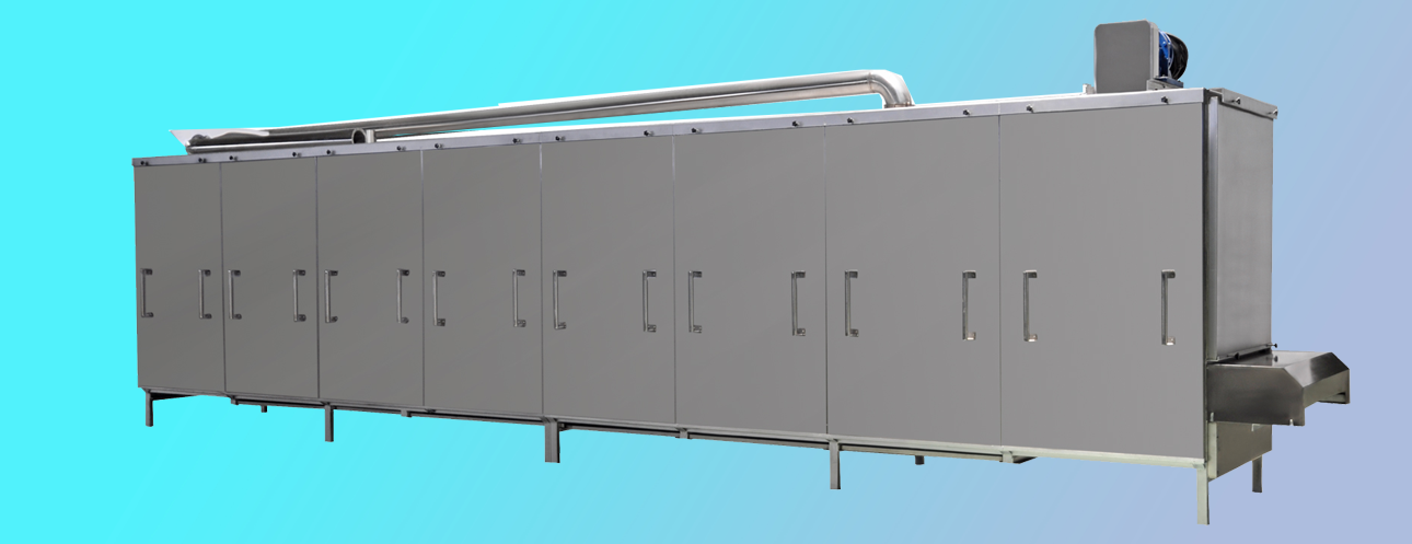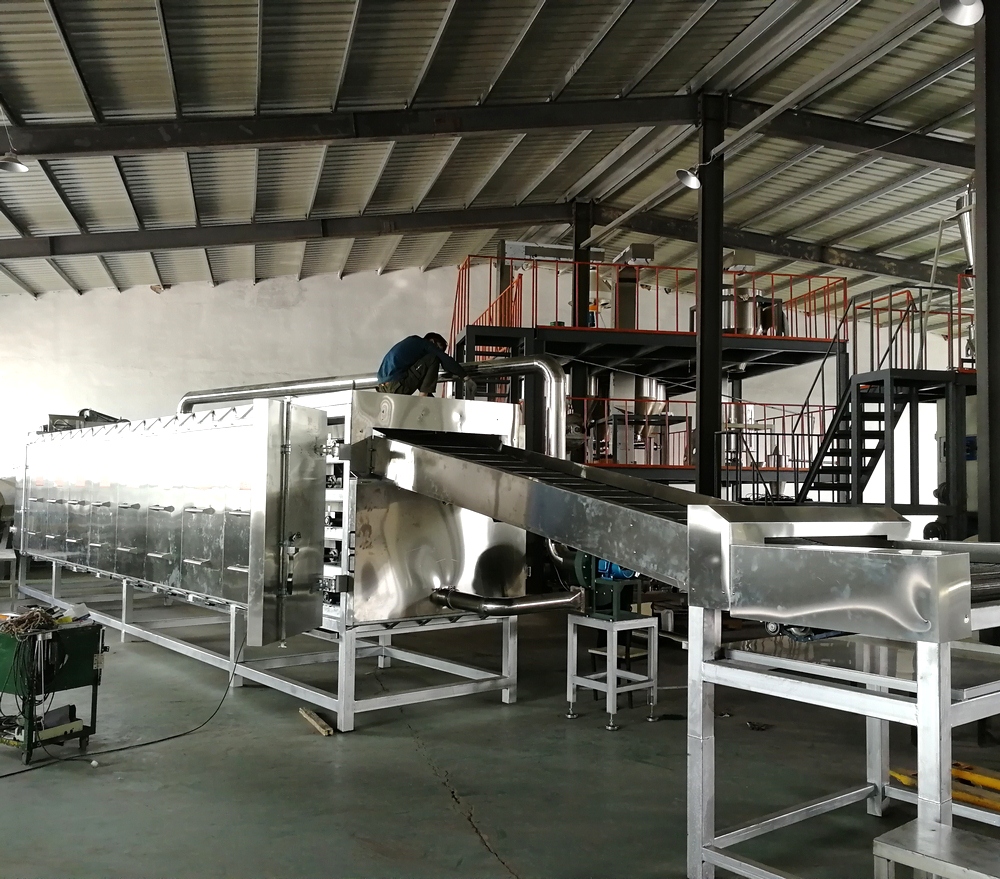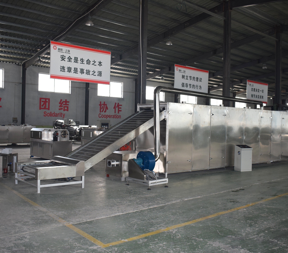 烤箱上料方式:可以直接選用帶爬坡結(jié)構(gòu)和外部借助輸送機(jī)送入烘干機(jī)料床,直接爬坡的烘干機(jī)結(jié)構(gòu)可以更直觀的觀測(cè)到物料布料狀況,多用于產(chǎn)量較大的生產(chǎn)線;借助外部上料的烤箱占地面積小,安裝方便,多用于單臺(tái)膨化主機(jī)的生產(chǎn)線配置