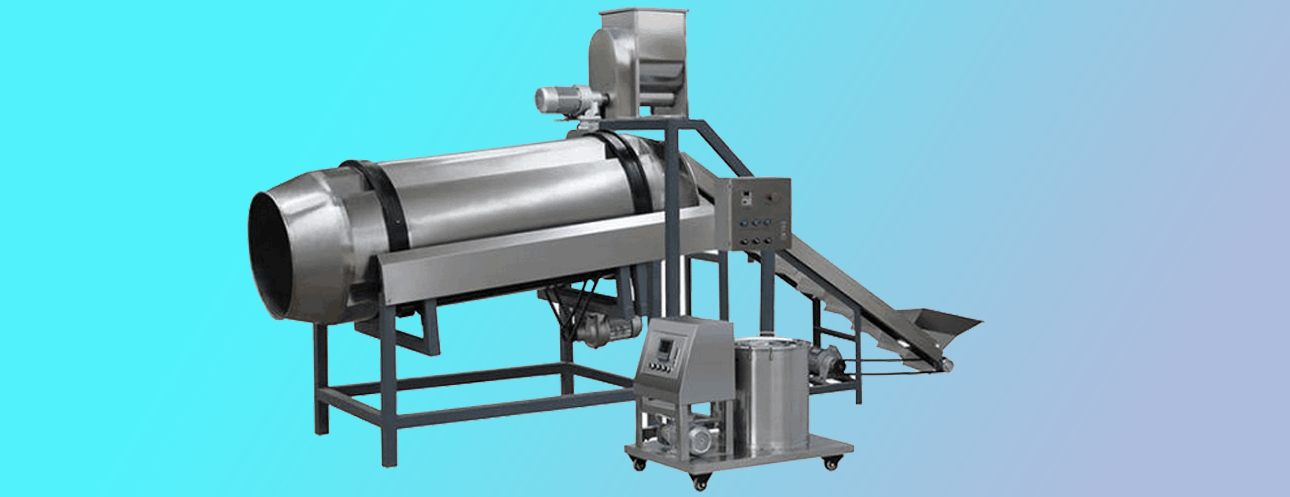 單滾筒調味設備主要用于休閑膨化食品、寵物食品的表面噴油與調味,具有產量高,可連續作業等特點。滾筒前端先噴油,物料表面有粘性后 在滾筒中端再撒入調味粉,調味粉可以更好的黏附在產品表面。